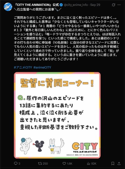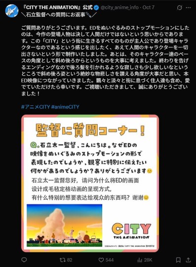 A:片尾曲做成毛绒玩具的定格动画是为了表明这部作品的登场人物并不仅仅是人类,在“CITY”这条街道上生活的所有事物都是故事的主人公。另外,这些角色基本都是以一个从身体斜后方看过去的角度出场的,这是为了给观众留下一些不舍、落寞的感觉。
